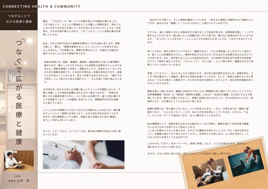 特集では、事務長・山田智による巻頭エッセイを通じて、「人と人」「医療と地域」「健康と暮らし」をつなぐ「場」の可能性を探ります。また、KAMATORI the 3rd Placeの活動報告や、いろのわビレッジの取り組み、看護師からの耳寄り情報など、地域のつながりを感じられる企画も盛りだくさん。