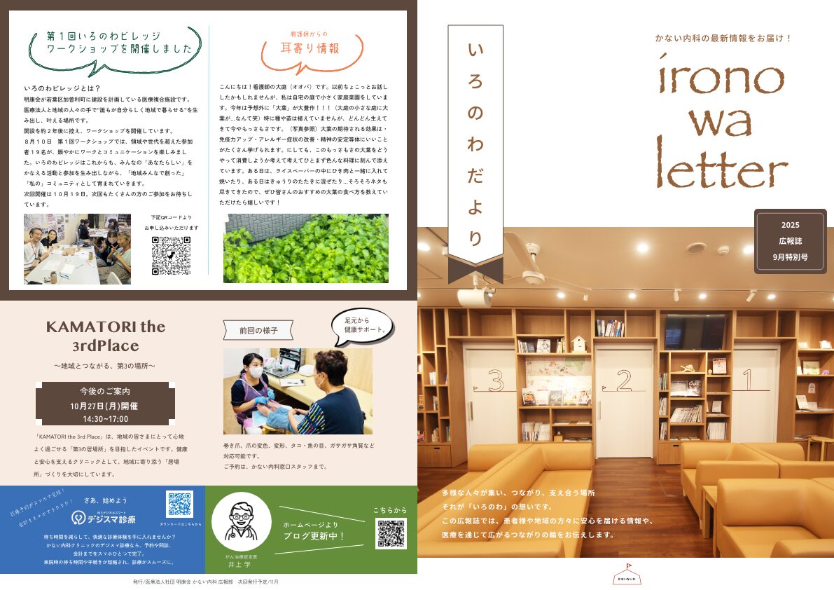特集では、事務長・山田智による巻頭エッセイを通じて、「人と人」「医療と地域」「健康と暮らし」をつなぐ「場」の可能性を探ります。また、KAMATORI the 3rd Placeの活動報告や、いろのわビレッジの取り組み、看護師からの耳寄り情報など、地域のつながりを感じられる企画も盛りだくさん。