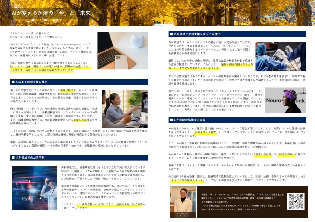 画像診断、手術支援ロボット、予防医療など、医療の現場で進むAI活用の可能性をわかりやすく紹介しています。